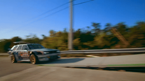 고속으로 후진한 뒤 타이어를 회전하여 차체를 회전시키고 좁은 틈에 밀어 넣고 있습니다.