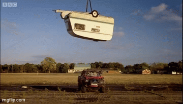 ▪ 캠핑 트레일러를 위에서 떨어뜨려 깔아뭉개고